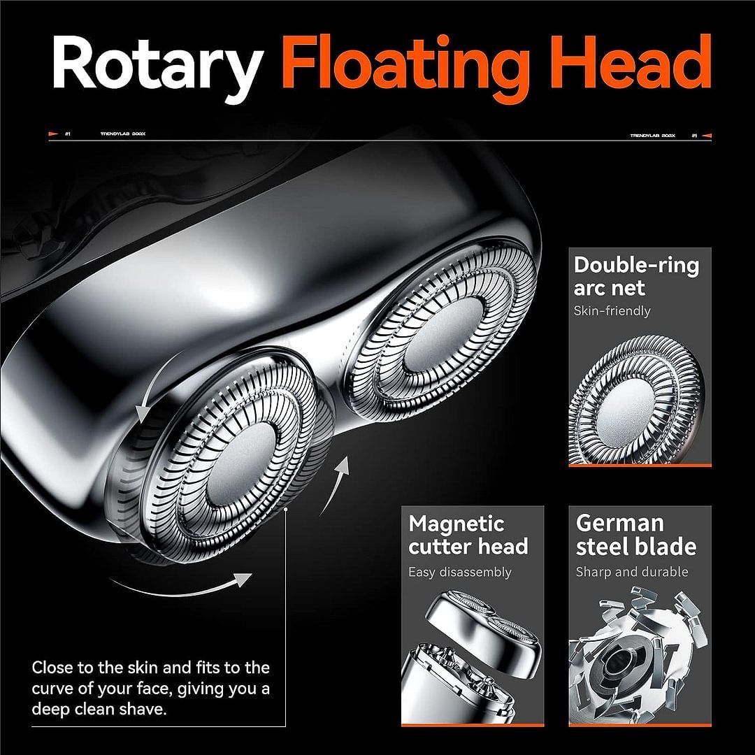 Sharp stainless steel whirl blade. specializing in hard beard. 0.1mm thin stainless steel foil. double ring 3D knife net. increase shaving volume. floating arc surface smooth and remove hair from your skin.