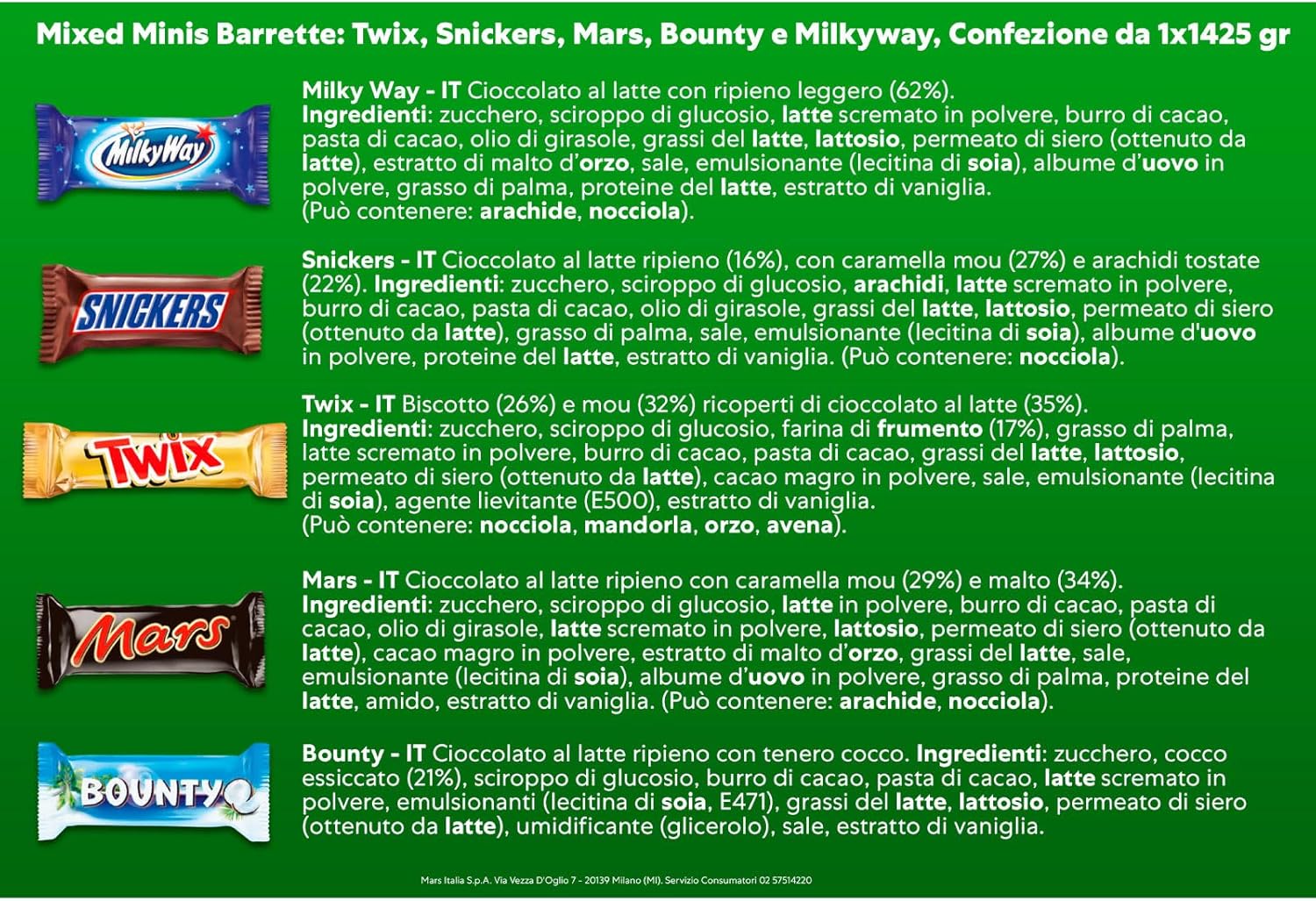 • Mars: Sugar, Glucose Syrup, Cocoa Butter, Full Cream Milk Powder, Cocoa Mass, Sunflower Oil, Skimmed Milk Powder, Lactose, Whey Powder (from Milk), Fat Reduced Cocoa, Milk Fat, Barley Malt Extract, Salt, Emulsifier (Soya Lecithin), Egg White Powder, Palm Fat, Milk Protein, Natural Vanilla Extract, Milk Chocolate contains Milk Solids 14% minimum